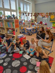 24.5.2022Po náročných přijímacích zkouškách vymysleli žáci třídy 9. A, v hodinách českého jazyka, pro své nejmladší spolužáky pohádky. V průběhu května navštěvovali některé třídy prvňáčků i druháčků a zde jim předčítali svou pohádkovou tvorbu.